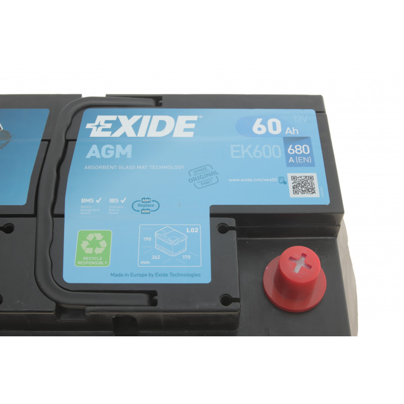EXIDE EK600 Акумуляторна батарея 60Ah/680A (242x175x190/+R/B13) (Start-Stop AGM) — Електрика від EXIDE. Підходить для: VOLKSWAGEN (GOLF VI кабрио (517) з 11, GOLF PLUS (5M1, 521) 12); SEAT (LEON ST (5F8) з 5, LEON (5F1) з 4); AUDI (A3 Sportback (8VA) з 5, A1 (8X1, 8XF) з 5); BENTLEY (CONTINENTAL купе з 10, MULSANNE з 9); SMART (FORTWO купе (453) з 11, FORFOUR Наклонная задняя часть (453) з 7); та ін..